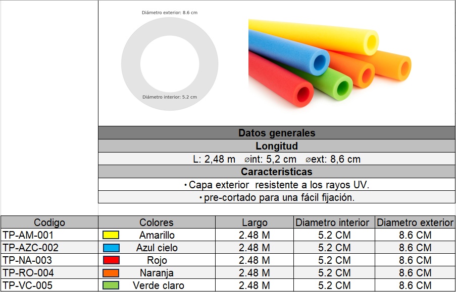 Tubo fabricado en espuma de polietileno de baja densidad (PE-LD foam) de célula cerrada, no tóxica y reciclable. Están forrados con lonas PET-TDI de colores, impermeables y con protección UV grado 8, lo que garantiza durabilidad, resistencia al sol y máxima seguridad en parques infantiles.